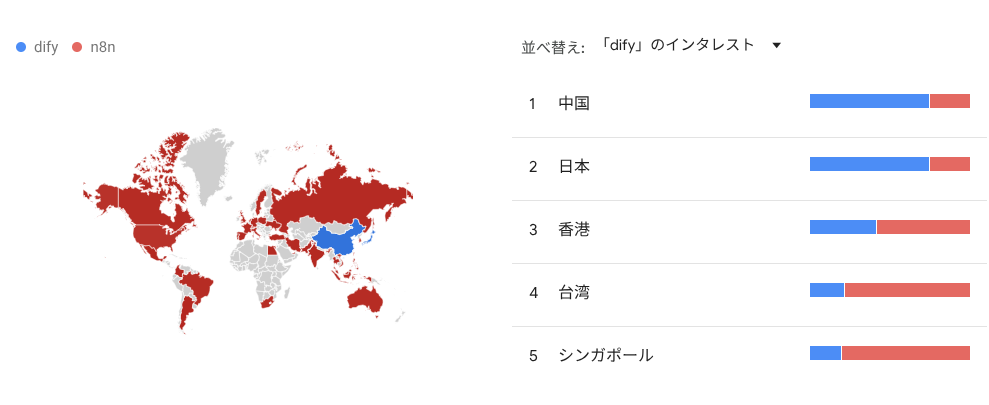 一方、アジア圏では人手不足や属人業務といった課題から、AIを業務改善に直接活用できるツールとする Dify への検索関心が高まっていると考えられます。