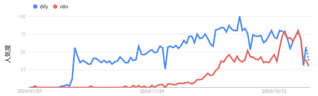 参照:Google Trend(Dify vs n8n [期間:2024/1~2025/12])