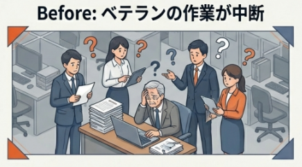 「この件、誰に聞けばいい?」ベテラン担当者が不在だと業務が止まる。回答待ちの時間ロス。